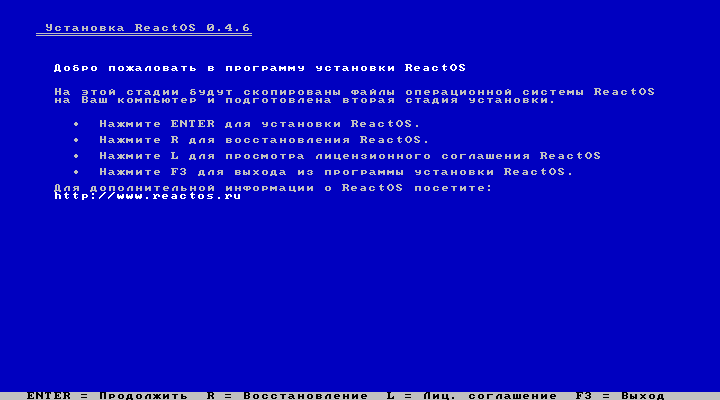 Следующим шагом нужно выбрать, что мы хотим сделать: установить ReactOS, восстановить её или посмотреть лицензионное соглашение. Нам нужно установить систему, поэтому нажимаем «Enter».