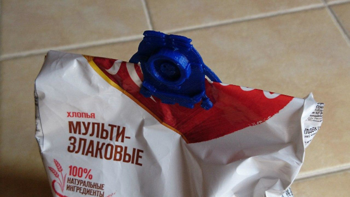 Этот зажим печатается относительно быстро, работает по принципу прищепки. Т.е. вы сжимаете его, и он открывает «пасть». А дальше закусываете им пакет. Очень просто и эффективно. Из PLA-пластика он получается достаточно тугим, чтобы хорошо держать пакеты закрытыми.